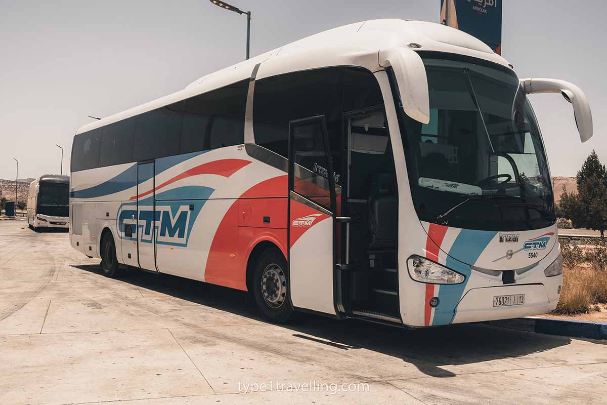 Modern CTM coaches run daily through the Atlas Mountains on the A7 highway, offering AC, comfortable seats, and professional drivers.